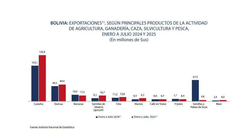 Entre los productos que subieron están la castaña, que pasó de $us 103,1 millones a $us 133,5 millones, y la quinua, de $us 44,5 millones a $us 49,4 millones. En contraste, las exportaciones de semillas de soya bajaron de $us 61,5 millones a $us 4,6 millones tras el veto que se levantó en junio.
