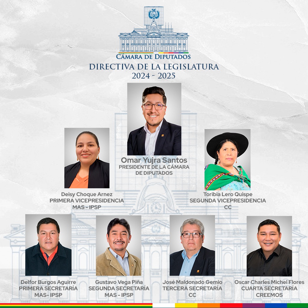 En Sesión de la Cámara de Diputados, fue elegido para la legislatura 2024-2025, Omar Al Yabhat Yujra Santos (MAS-IPSP) como presidente de este ente legislativo, Deisy Judith Choque Arnez (MAS-IPSP)…