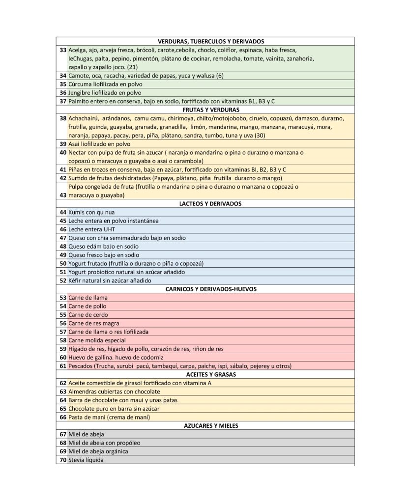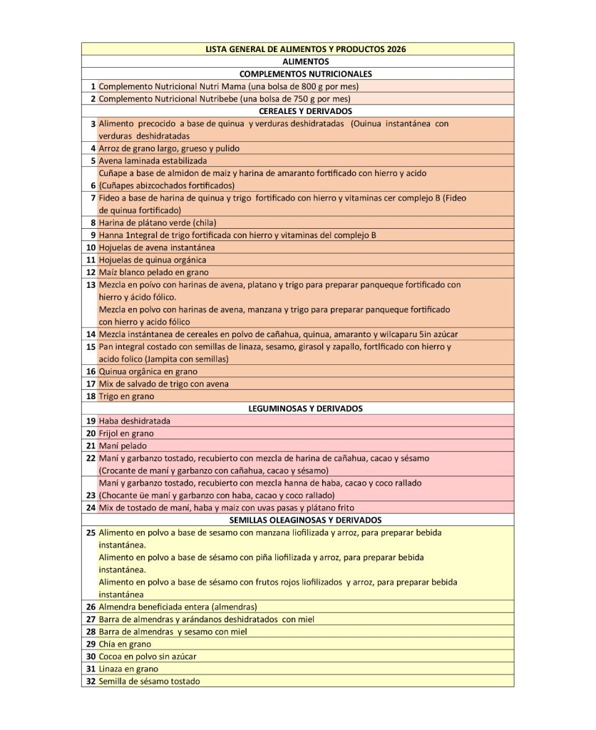 Entre los nuevos productos destacan carne de cerdo, hígado, corazón, huevos de codorniz, pescados, yogur probiótico, quesos bajos en sodio, avena, salvado, harina de plátano verde, maíz y maní pelado. También se mantendrán productos tradicionales como Nutrimamá, Nutribebé, arroz, leche, huevos, quinua, miel, carne de llama y fideo.